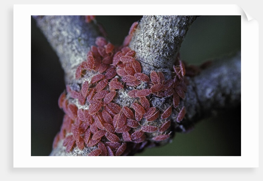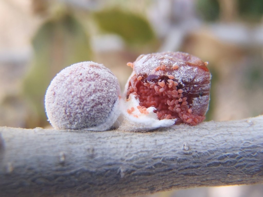 There is a very short window of time – about 1 month in the summer – while the Kermes Vermilio is attached to the tree – after the eggs are laid but before they hatch – in which the females may be harvested and a permanent red dye may be extracted. The inside holds a concentrated red dye while the outside is snowy white.