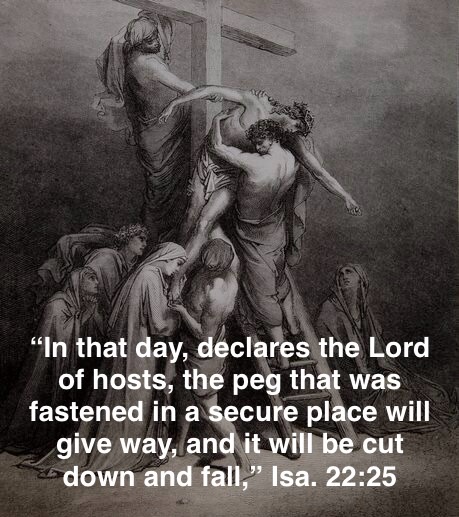 “In that day I will call my servant Eliakim the son of Hilkiah, and I will clothe him with your robe, and will bind your sash on him, and will commit your authority to his hand. And he shall be a father to the inhabitants of Jerusalem and to the house of Judah. And I will place on his shoulder the key of the house of David. He shall open, and none shall shut; and he shall shut, and none shall open. And I will fasten him like a peg in a secure place, and he will become a throne of honor to his father’s house. And they will hang on him the whole honor of his father’s house, the offspring and issue, every small vessel, from the cups to all the flagons. In that day, declares the Lord of hosts, the peg that was fastened in a secure place will give way, and it will be cut down and fall, and the load that was on it will be cut off, for the Lord has spoken.””