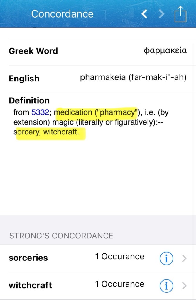 There ARE “potions” involved. THIS is the Greek word translated “witchcraft” and “sorceries” in the New Testament. It’s only used twice: