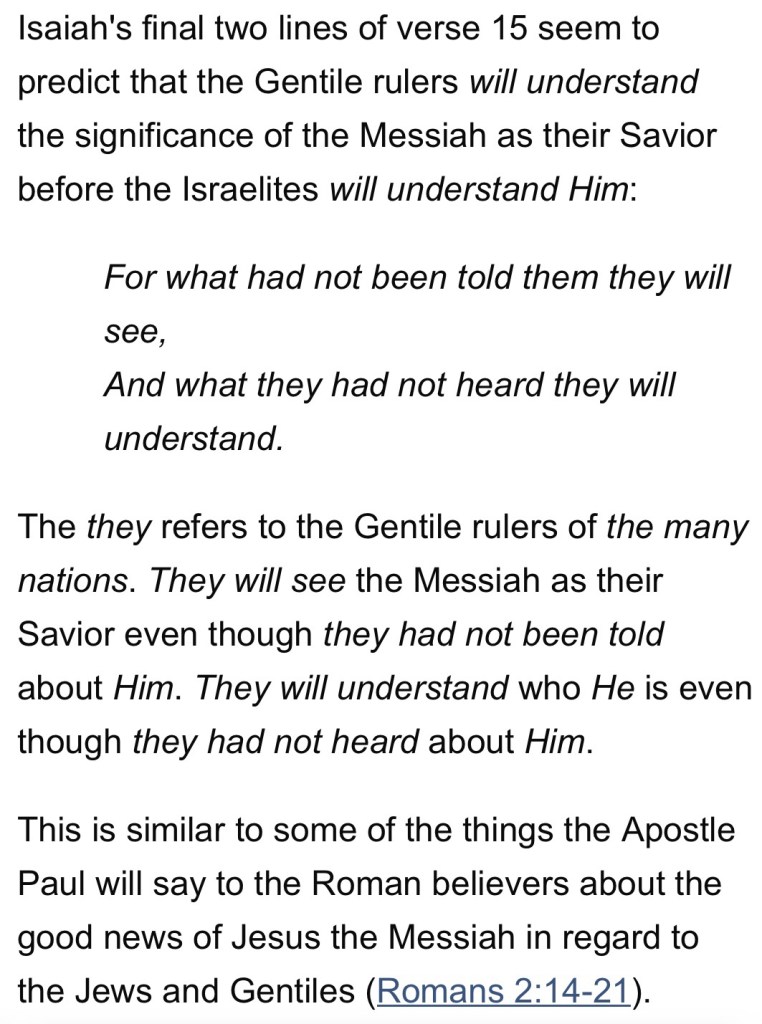 It’s undeniable. The nation of Israel is not THIS disfigured Servant. This servant is going do something we see almost exclusively in the context of a priest making atonement and purification. He is going to “sprinkle” many nations.
